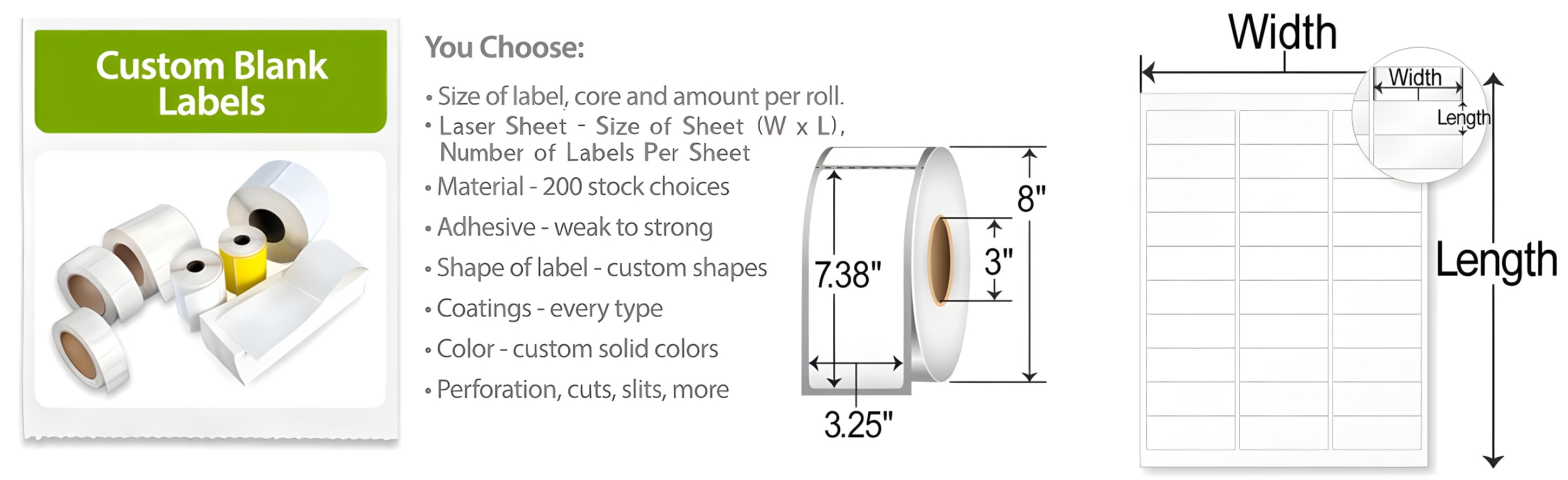 We can manufacture any size labels you need on standard rolls or sheets. We also offer custom quantities per roll.