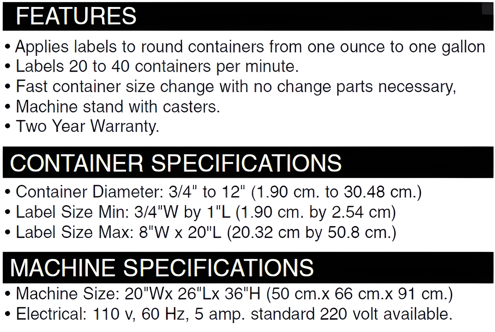 The Advent Model 300 Pressure- Sensitive Labeling Machine is unique when compared to other semi-automatic P-S labelers. With its ingenious design, air pressure and an electronic photoeye are not required in its operation. Air pressure on other machines is required to lift the container up to the point of label application and then down where it is removed. This raising and lowering of the container wastes time. Advent has chosen to apply the label from the bottom of the container and use the weight of the container to press on the label. This method saves application time and increases labeling speed considerably. On other machines, the label sensing switch senses the space between labels on the label web in order to tell the machine when to feed a label. Advent does not require this switch which enables it to apply butt cut labels along with die cut labels. The Advent Model 300 is 3-shift labeler. The 300 can easily label up to 10,000 containers in 8-hours. It can handle continuous operation and is backed by Advent's 2-year warranty.