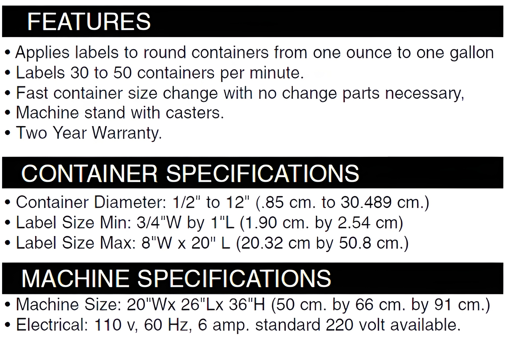 The Advent Model 310 is what you might call an almost automatic Pressure-Sensitive labeling machine. Containers are fed into the machine by hand but are ejected automatically. As the operator places the container into the machine the previous labeled container is pushed forward and onto a short gravity conveyor. If the containers are filled, they roll forward to the packing station. If they are empty, they can roll off into a box or go directly to the filling line. By handling each container only once, labeling speed is increased considerably. Speeds up to 30 to 40 containers per minute are not uncommon.