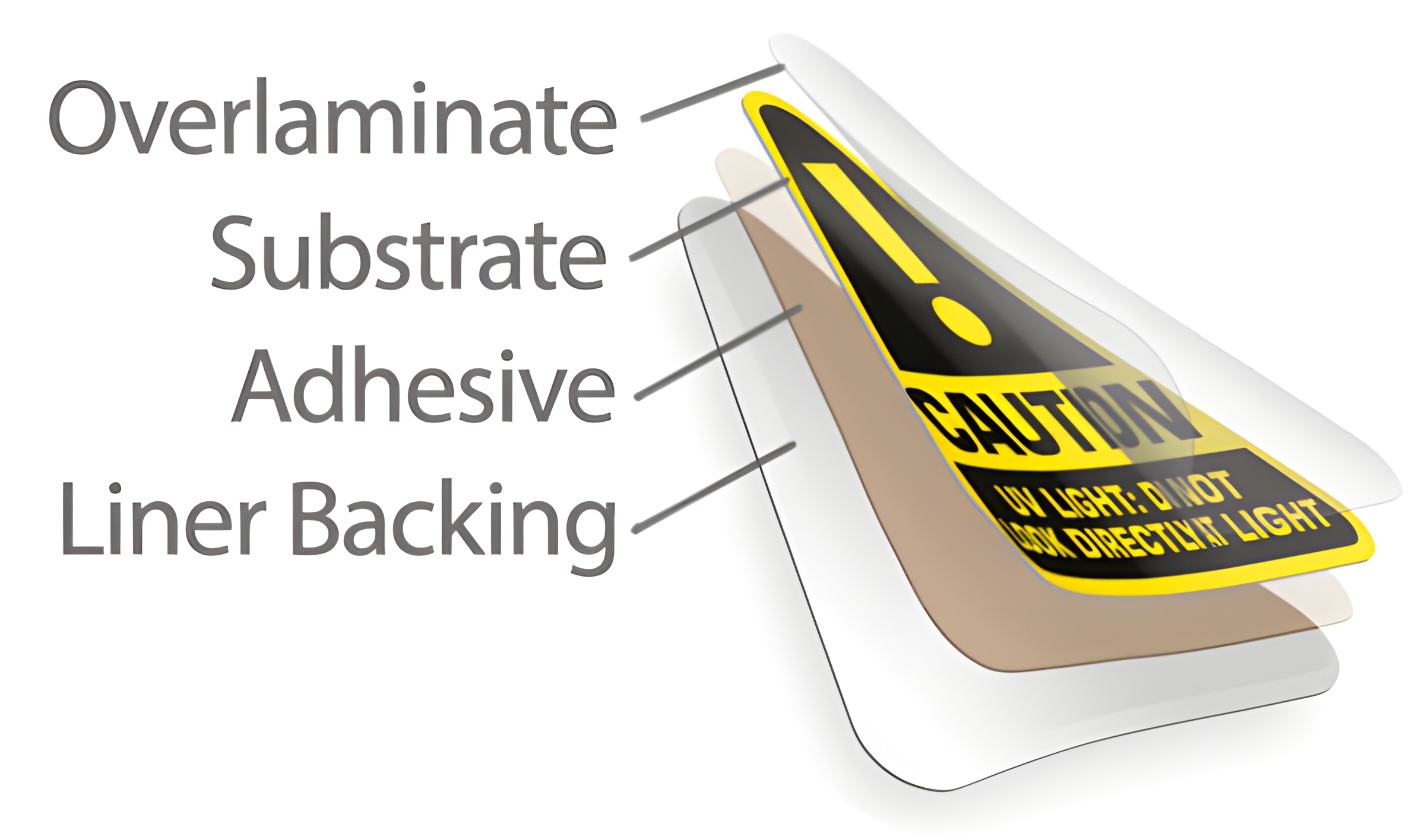 Durable Label Construction- Durable roll labels are made of specific combinations of Permanent Adhesives applied to a variety of Synthetic substrates, Light-fast UV inks are printed on the substrate and over-laminated with a variety of films for ultimate protection.
