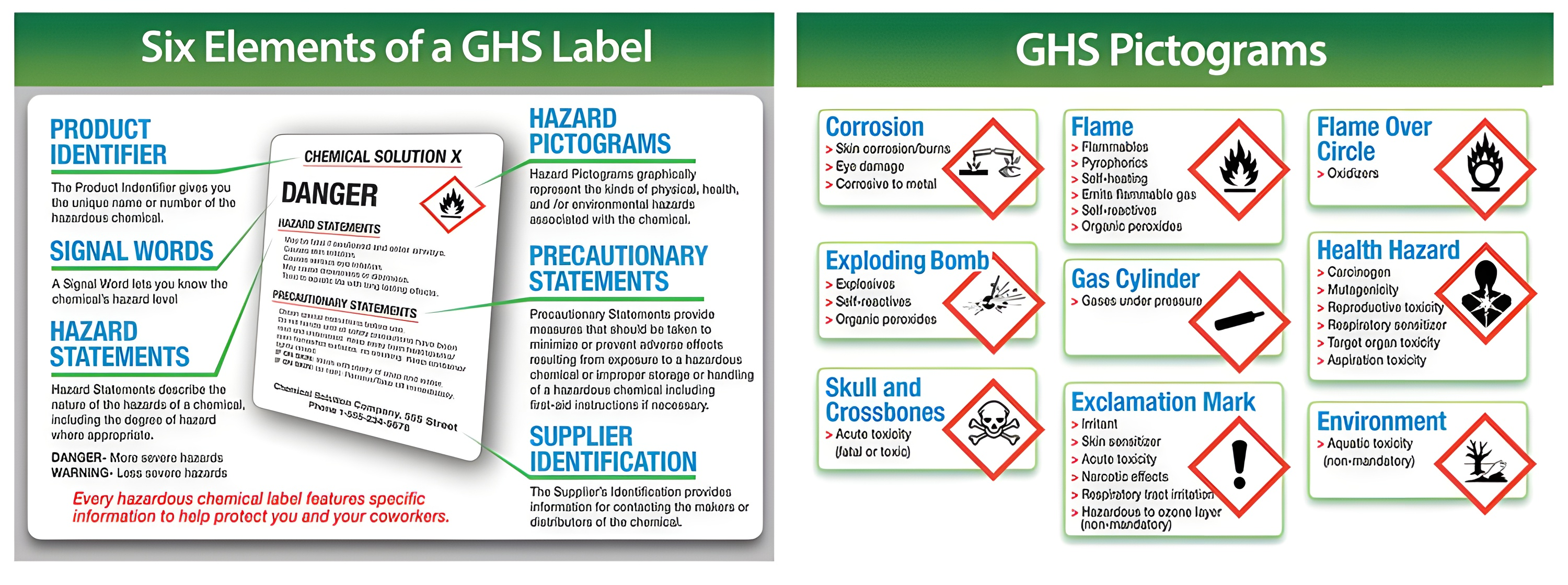 The Global Harmonized System (GHS) of classification and labeling of chemicals is an internationally agreed-upon standard managed by the United Nations that is legally required in the United States for hazardous material handlers. It was officially adopted in the U.S. on March 26, 2012, by the Occupational Safety and Health Administration (OSHA). GHS labels must contain required information and other elements, and they must be easily understood. For instance, all shipped hazardous chemical containers must be labeled with a signal word, pictogram, hazard statement, and a precautionary statement for each hazard class and category.