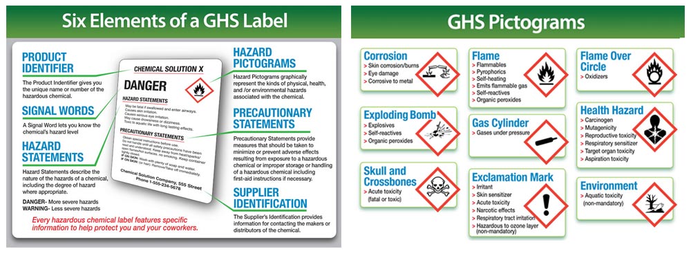 The Global Harmonized System (GHS) of classification and labeling of chemicals is an internationally agreed-upon standard managed by the United Nations that is legally required in the United States for hazardous material handlers. It was officially adopted in the U.S. on March 26, 2012, by the Occupational Safety and Health Administration (OSHA). GHS labels must contain required information and other elements, and they must be easily understood. For instance, all shipped hazardous chemical containers must be labeled with a signal word, pictogram, hazard statement, and a precautionary statement for each hazard class and category.