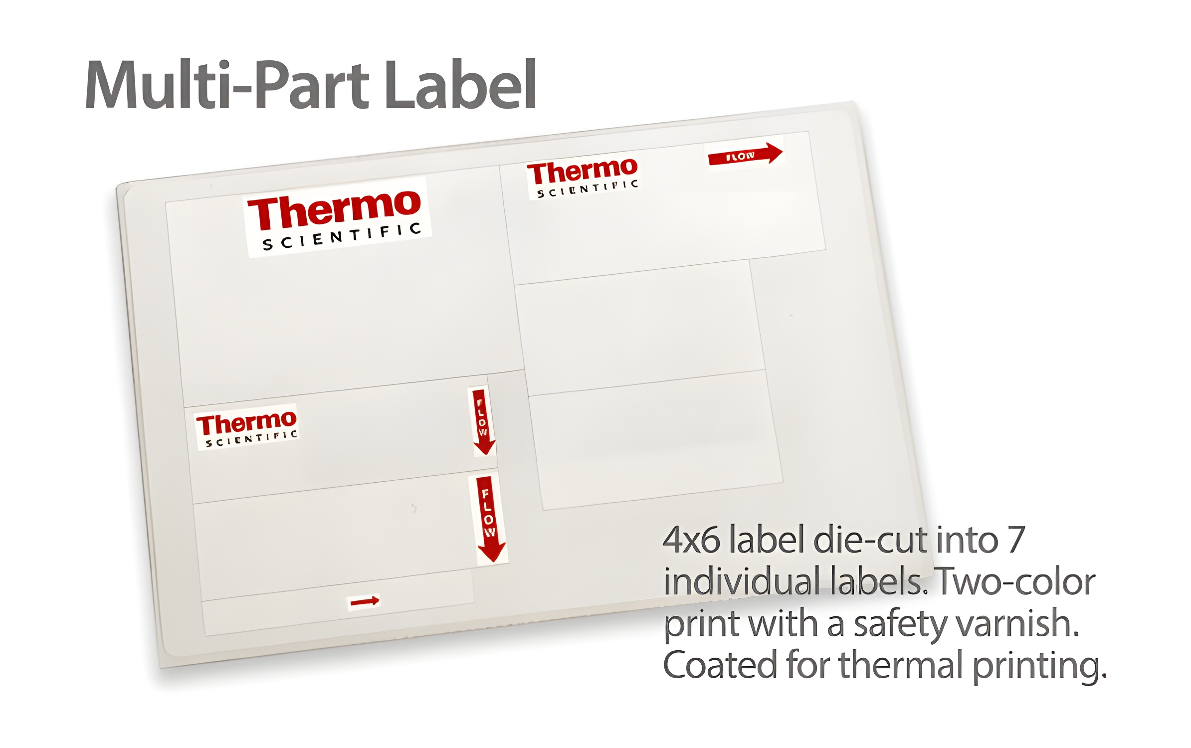 Multipart labels can be pre-printed, with barcodes or variable data, or blank. These labels can have special size and shape labels contained within 1 sheet label. Available in direct thermal, thermal transfer, laser, or inkjet label material.