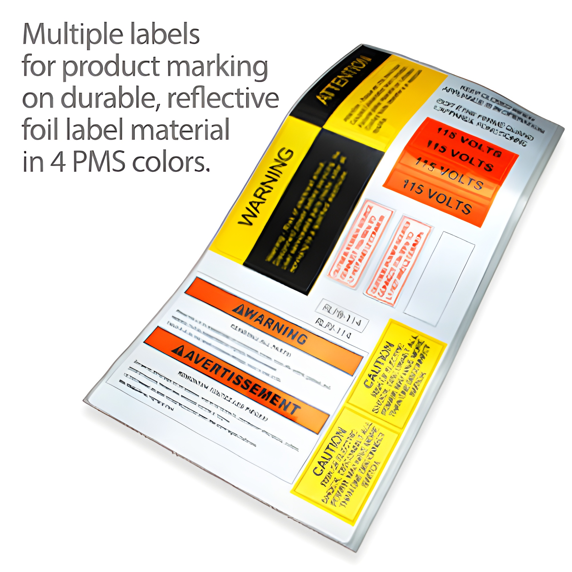 This 6 in. x 12 in. custom printed label is die-cut into 13 separate labels used to mark multiple areas of a product. This label was printed in four PMS colors on foil label material for durability and water resistance.