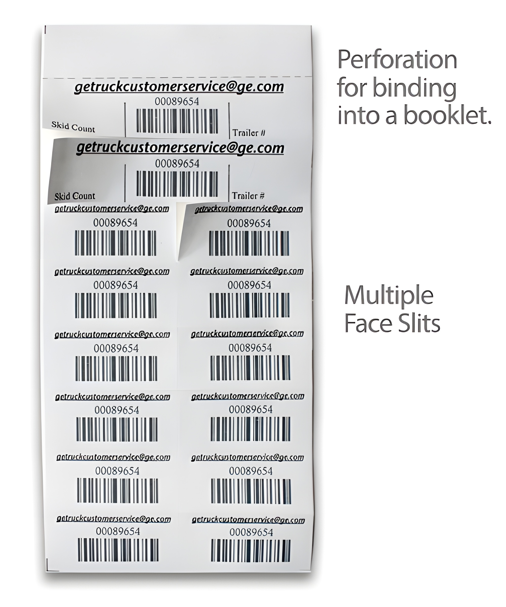 Here, multiple labels have been face slit out of one large label. These label sheets are perforated at the top and bound into a booklet.