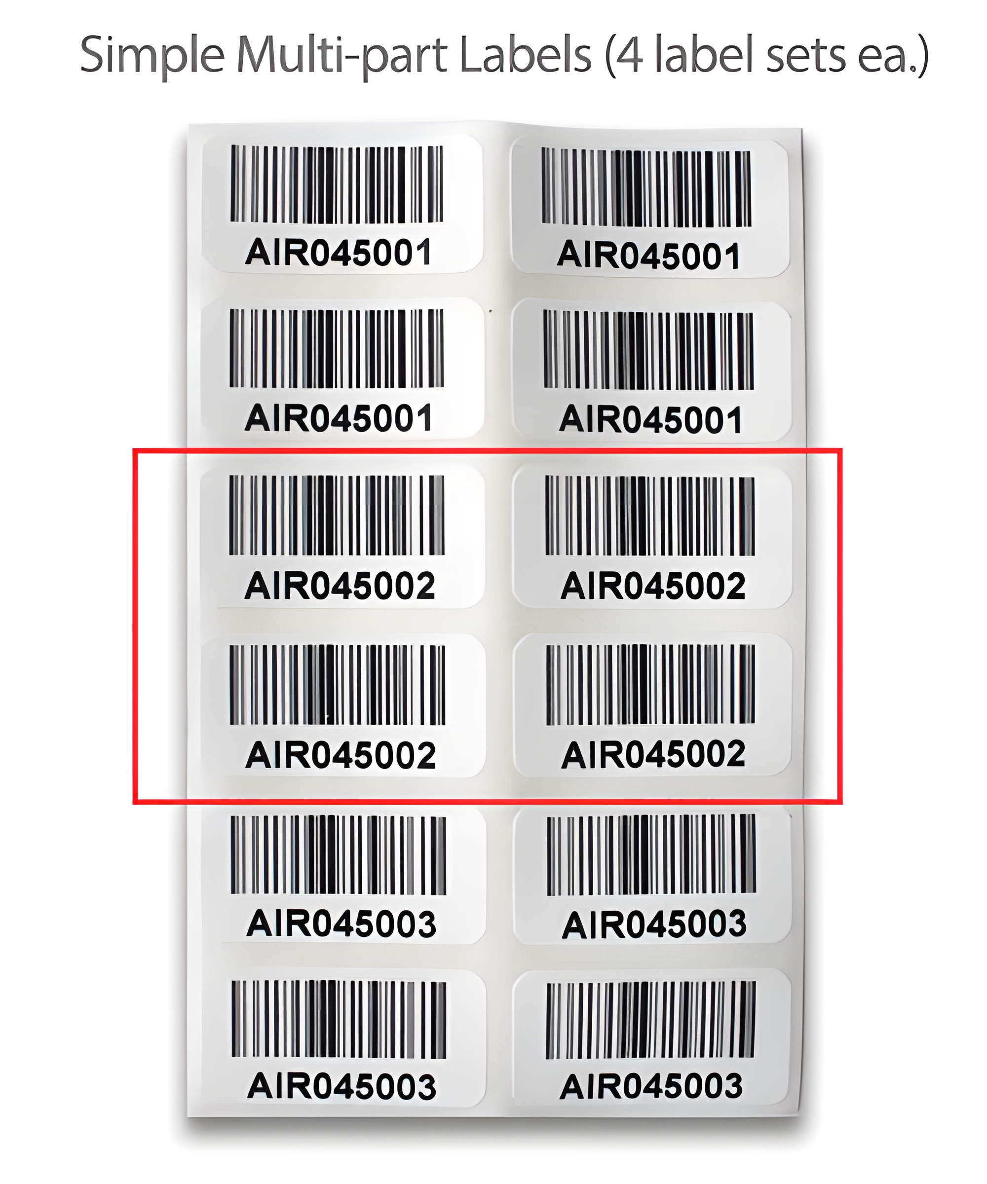Manufactured on rolls or sheets and on a wide variety of different label material and adhesive combinations, a multipart label function as a "set" of labels with combined uses. Multipart label sets are an efficient way to link common information to a "set" of different sized labels. Common use are: Asset Tracking, Multi-part Product Labeling, Inventory Control, Work Functions in Progress, Legal/ Medical Records Tracking or Security Measures. Label Sets are a safe and efficient and cost-effective way to mark just about anything.