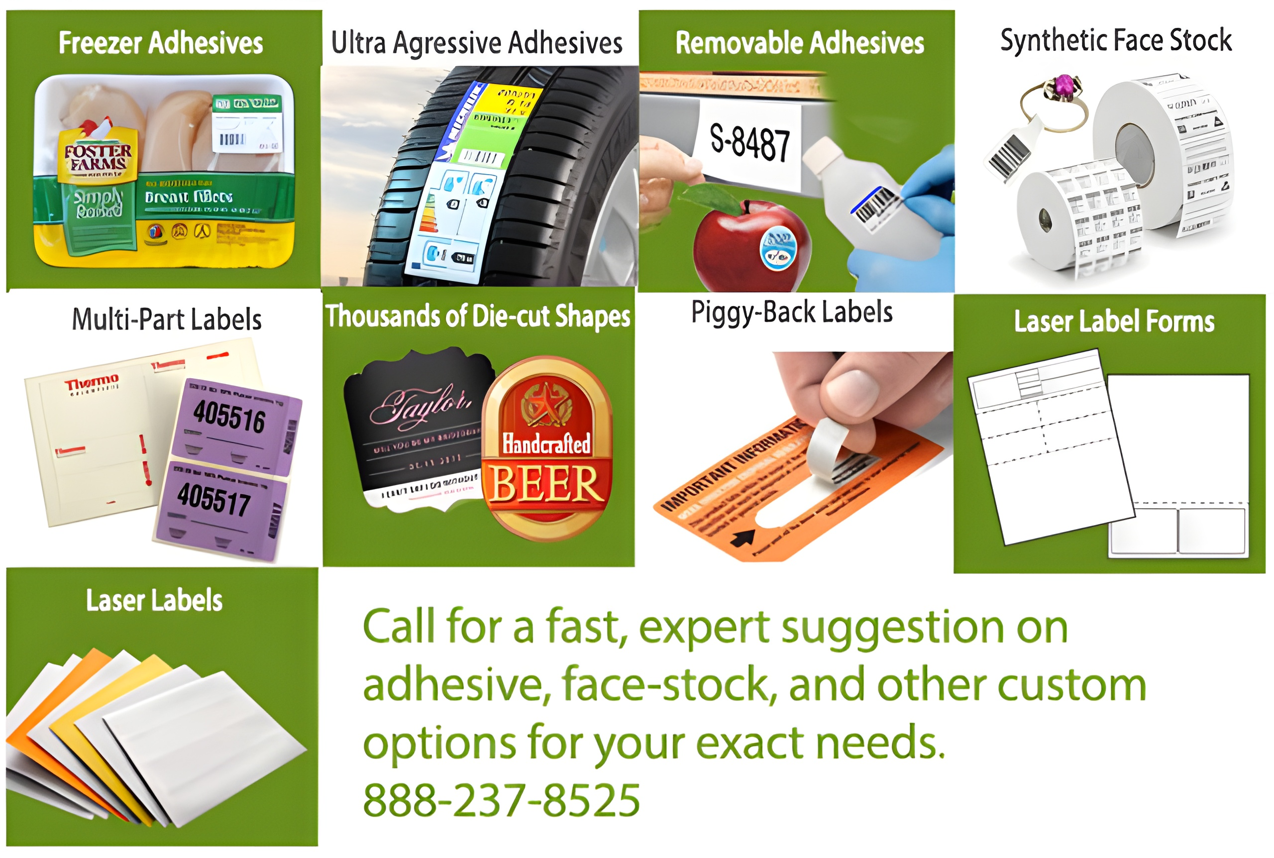 Barcode Factory is more than your source for printers and blank thermal labels. We offer state-of-the-art technology for affordable, custom labels and stickers of all shapes, quantities and sizes. Let us help you with your project to find the right adhesive, label face stock and size. We offer both digital and flexographic processes, so your quantity can range from 100's of labels to millions.