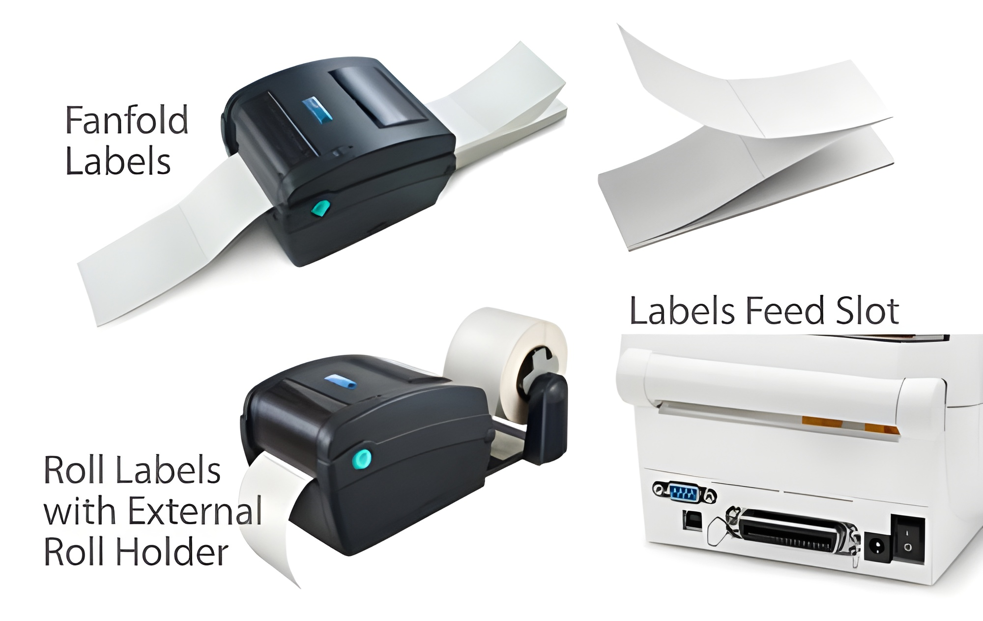 Almost all printers have an external feed source in the back of the printer. Label Unwinders help hold roll label material (up to 12 inches) as the printer pulls it in. Options include no adjustment for breaking or adjustable frictionless breaking on Non-powered units.