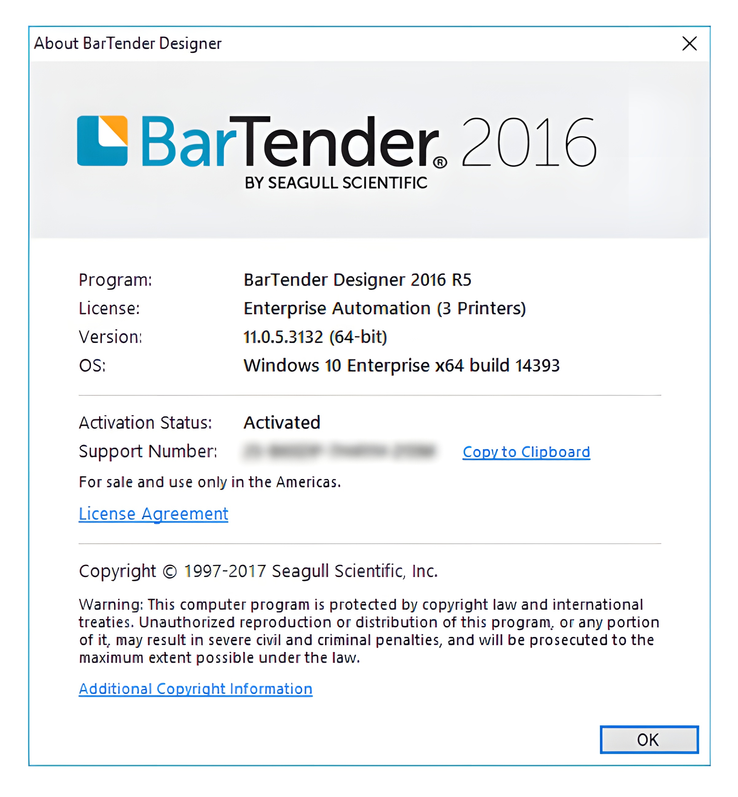 This is the specific version and build number of BarTender. This is usually not needed as the release number (e.g. R5) ties to a specific version number. You will also see the bit level or architecture of BarTender in parenthesis. Starting with BarTender 2016, we introduced a 64-bit build, so you'll either see 32-bit or 64-bit here. This information is often useful when contacting support and troubleshooting some problems.