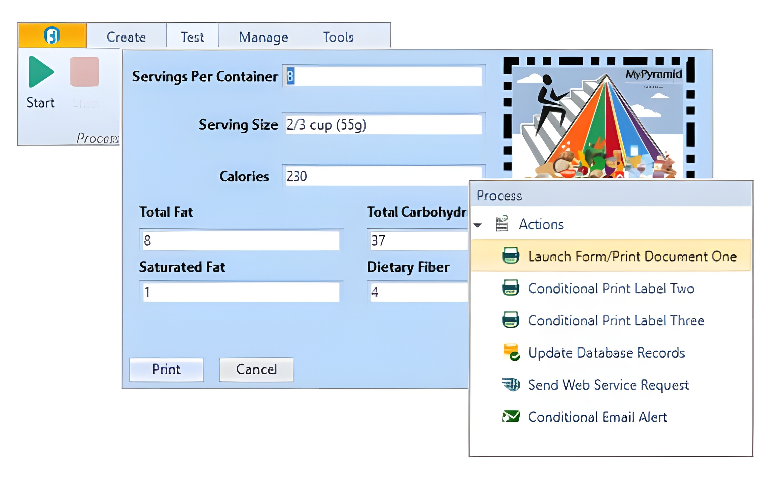 Without writing any code, build your own BarTender label printing application by linking processes and actions to one another to create Intelligent Forms ™.