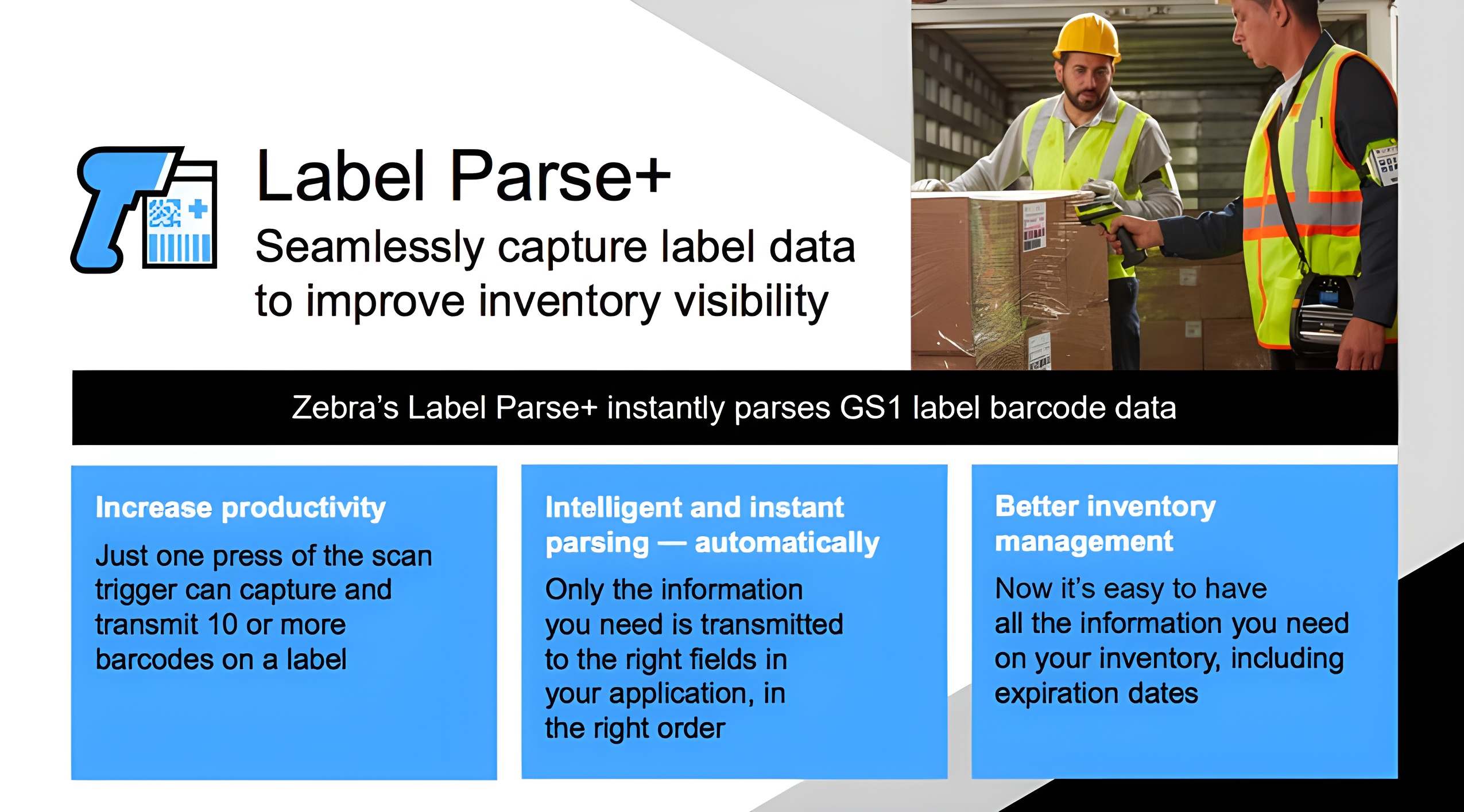 Zebra Label Parse+ Introducing Label Parse+, a complimentary Zebra DataCapture DNA tool that captures all the required barcodes on one or more labels, with one click of the scanner. The data is intelligently parsed, instantly — only the information you need is transmitted to the right fields in your application, in the right order. So whether you're capturing lot number and manufacturing location for track and trace or deliver- and sell-by dates for better inventory management, you can be sure the information you need on your products throughout the supply chain is available and accurate.