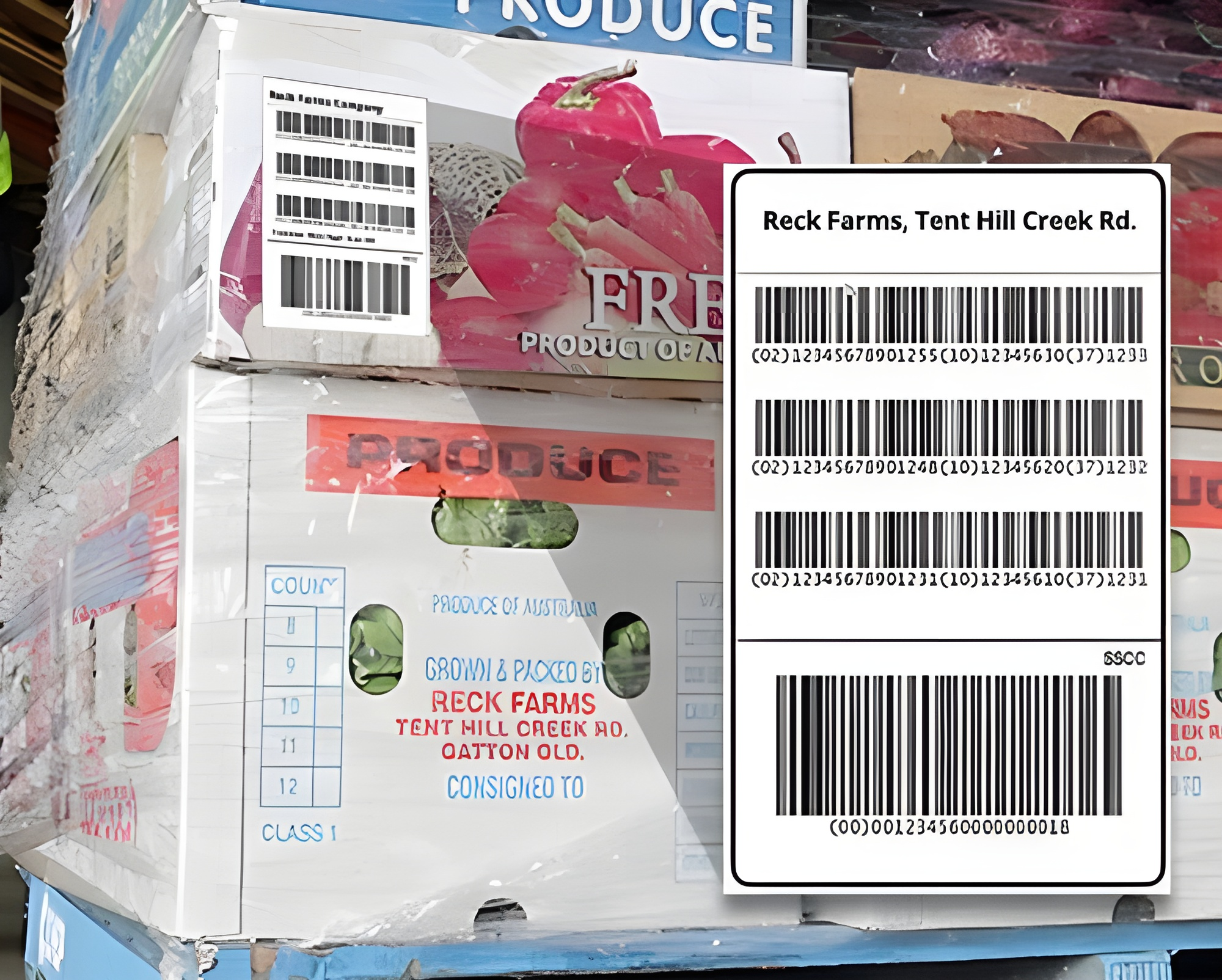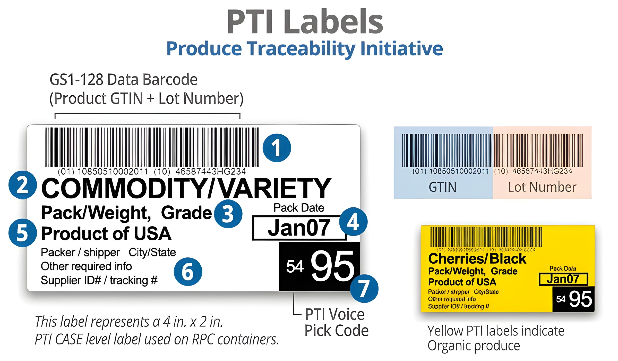 PTI labels that meet "content" requirements are applied to multiple levels of produce shipping containers, from cases to pallets.