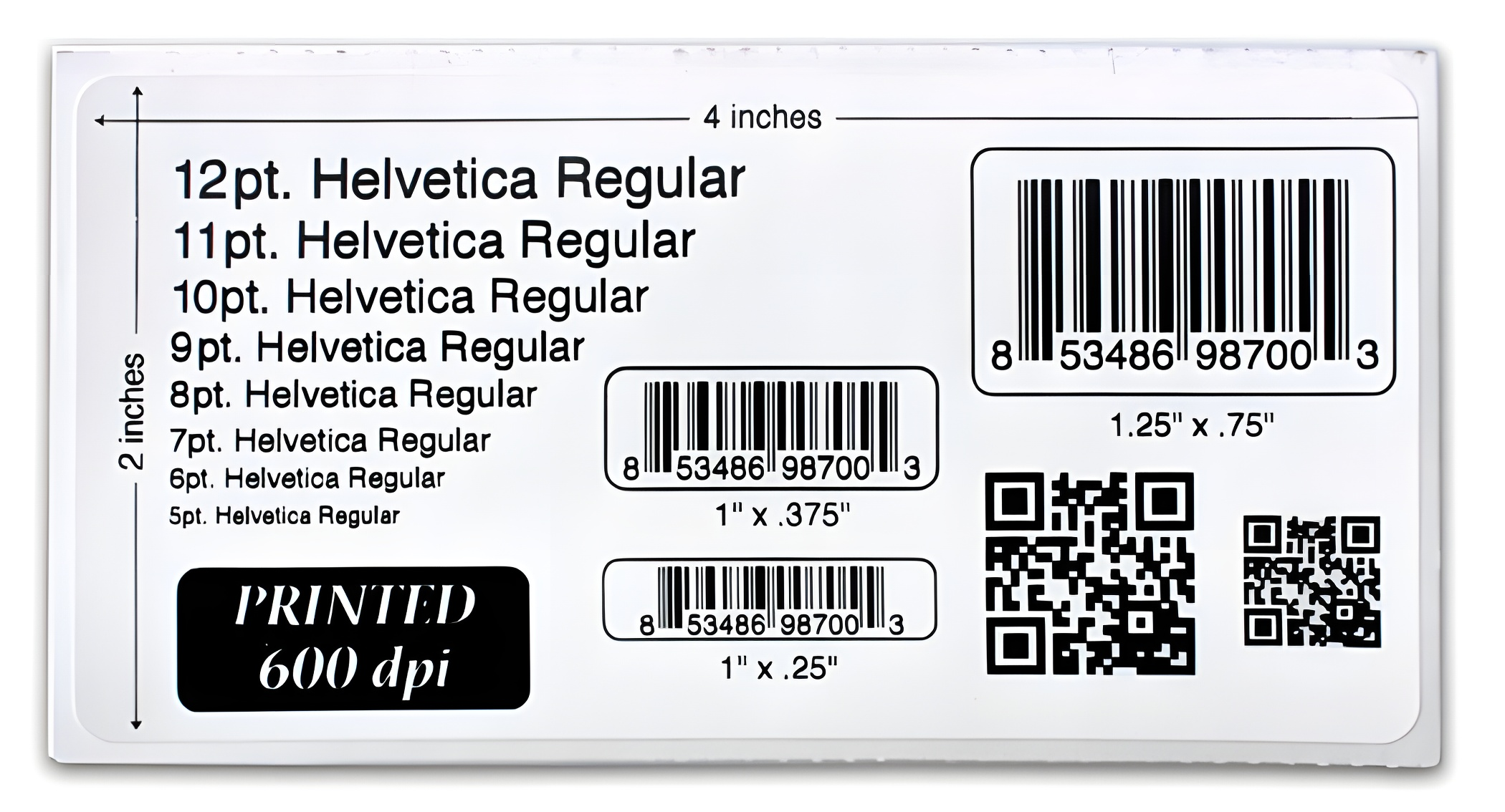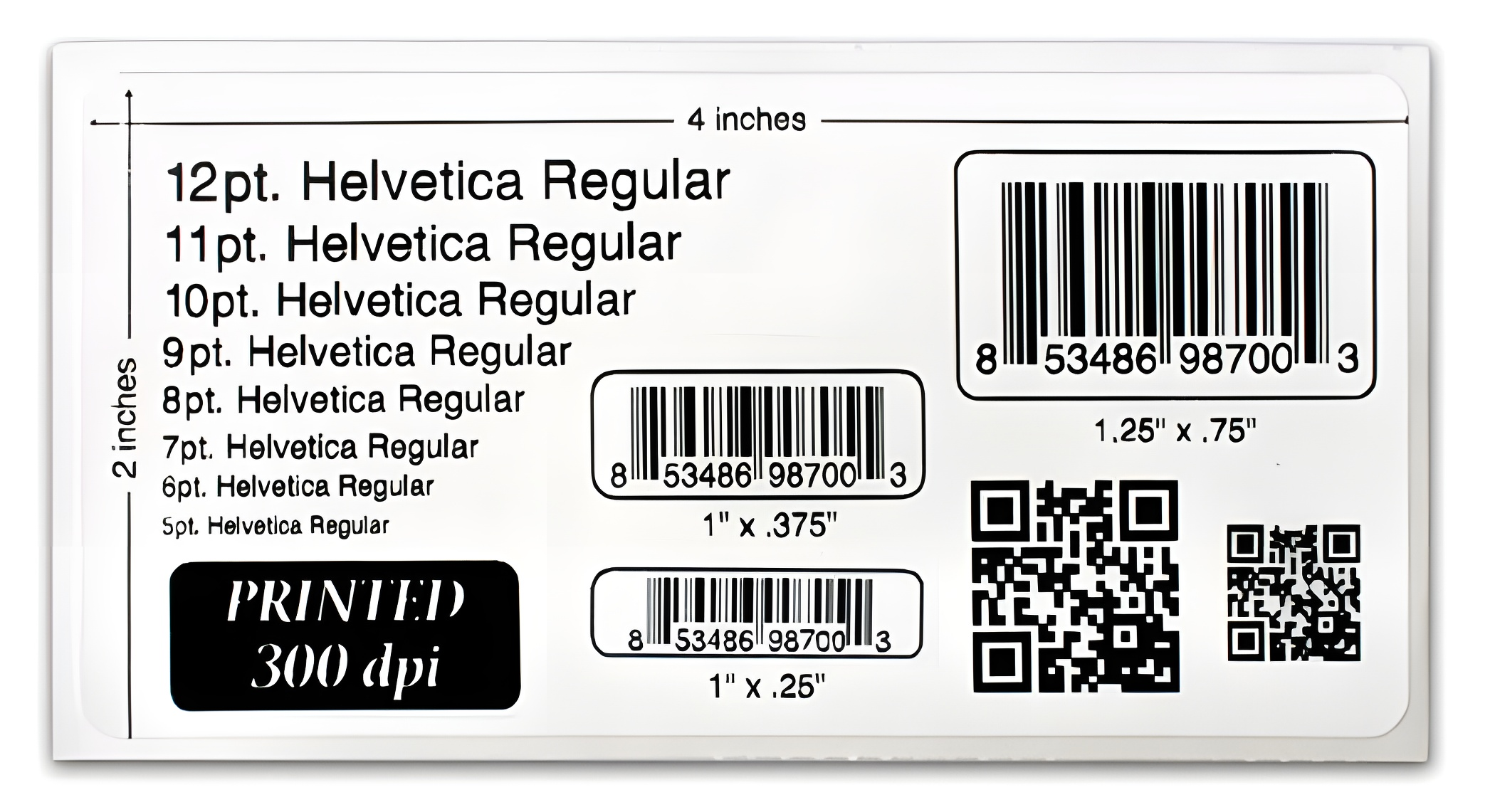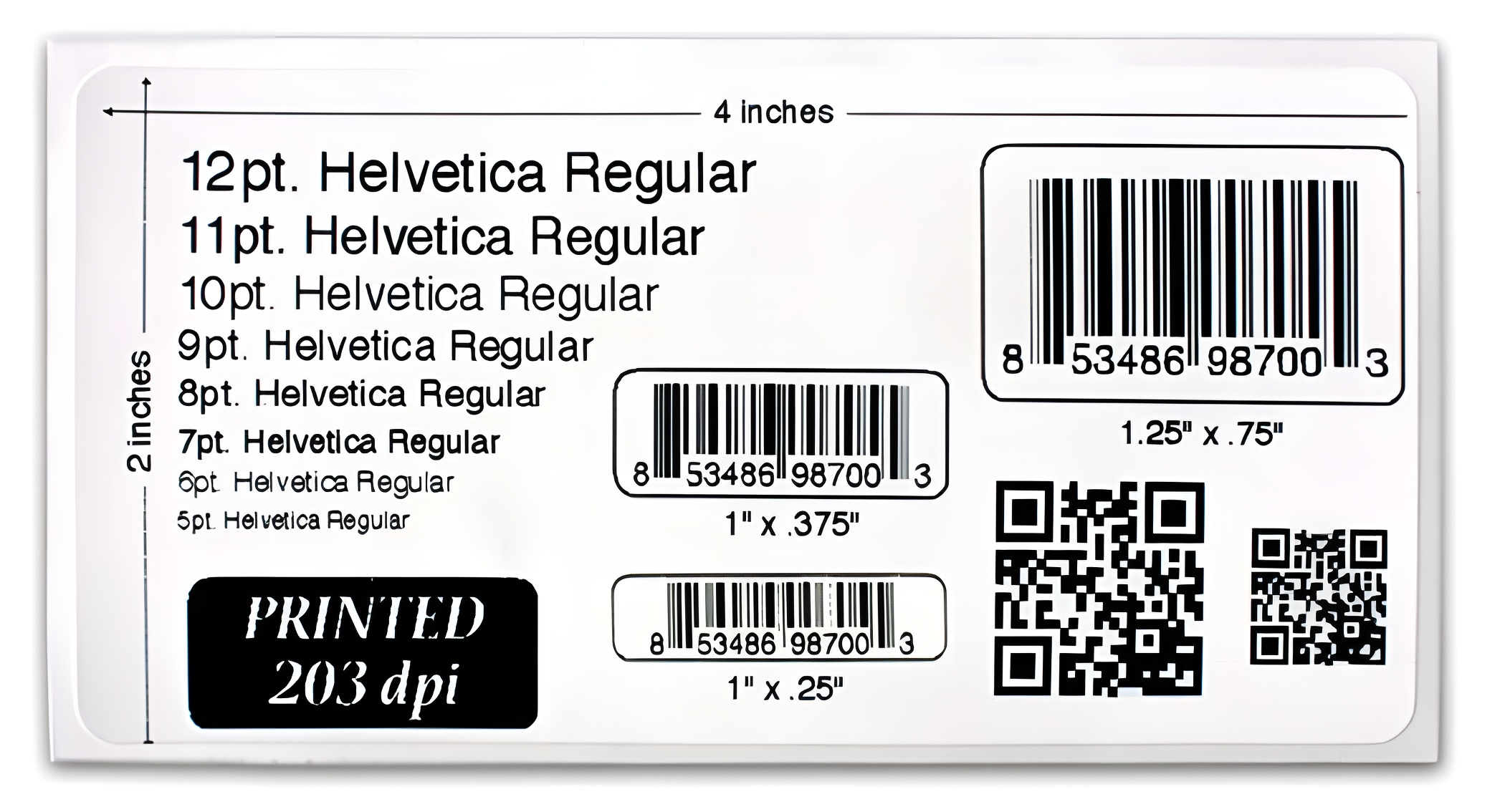 The printer, ribbon, label, speed and temperature settings you use will all have an effect on the labels you print. Below are samples of a 4" x 2" label printed on polypropylene matte stock using a wax-resin combination ribbon on a Zebra ZT104 Industrial Printer. A PDF sample can be downloaded here and printed at 100% size for a visual reference of type size and barcode sizes.