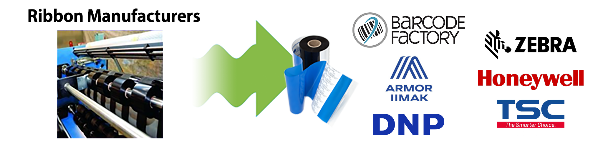 Two of the major USA Ribbon manufacturers are iiMak and DNP. These companies sell only to certified Distributors such as Barcode Factory and other OEM printer manufacturers. All ribbons are manufactured to OEM specifications, so shopping the best price makes perfect sense. BarcodeFactory not only has the lowest prices but offers FREE Samples and will help you choose the best combination of thermal ribbon and label. Call us for more information 888-237-8525.