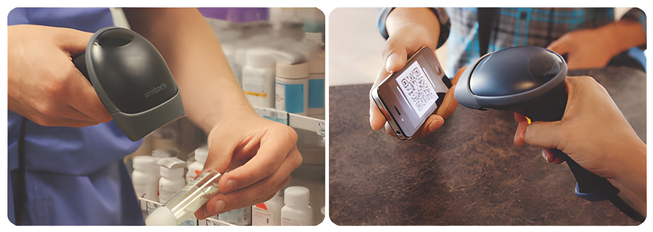 The MS842e 2D corded barcode scanner reads barcodes up to 6 inches away, a distance that meets and exceeds a wide range of applications. The MS842e can scan 1D linear barcodes and 2D barcodes, either printed on paper or represented digitally on a screen. Available for both standard and high density barcodes, this barcode scanner is versatile across the board.