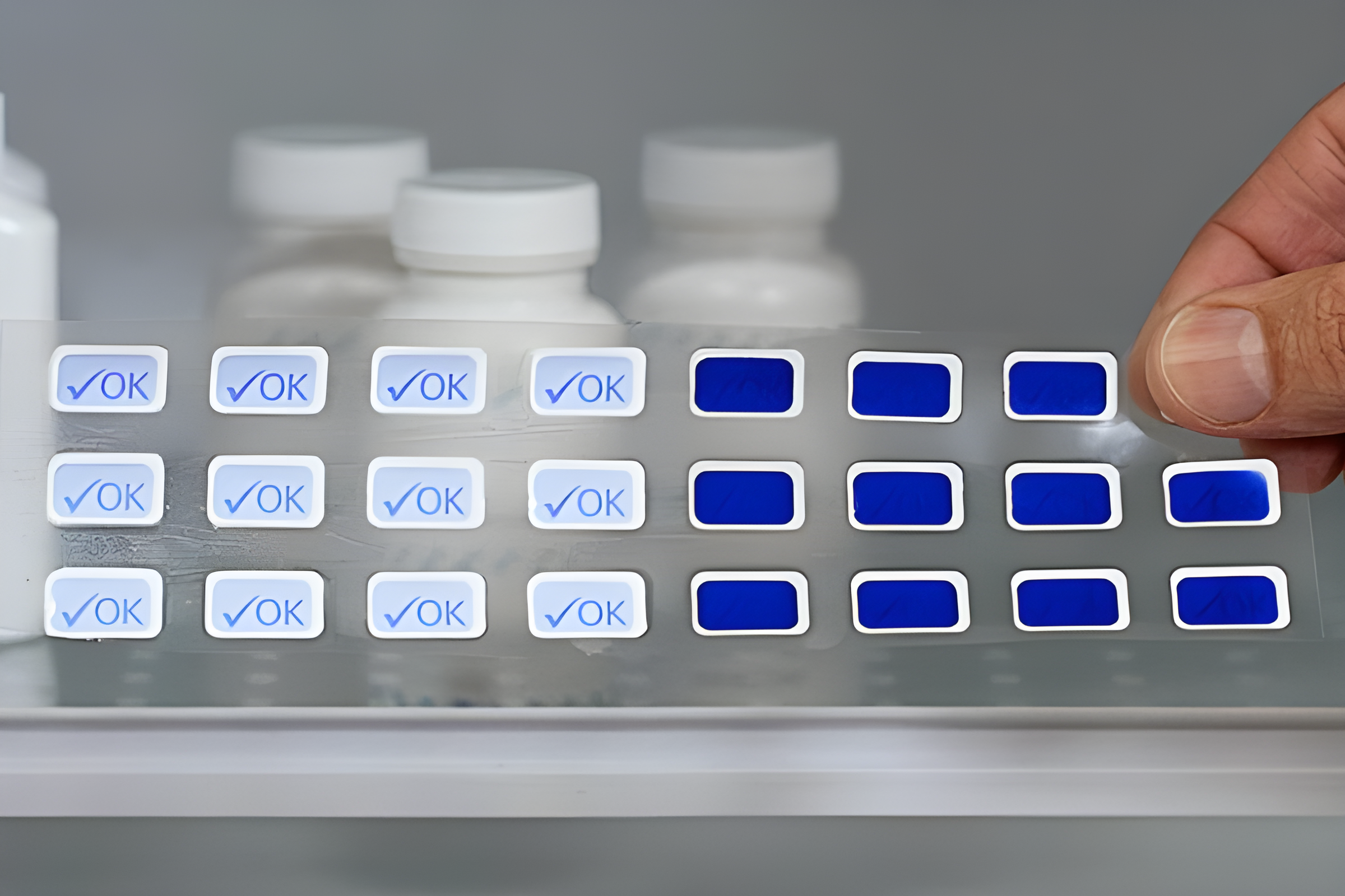 The indicators are 16 mm x 10 mm self-adhesive labels, easily applied to the primary packaging of products, where they can be viewed and intuitively understood by users.