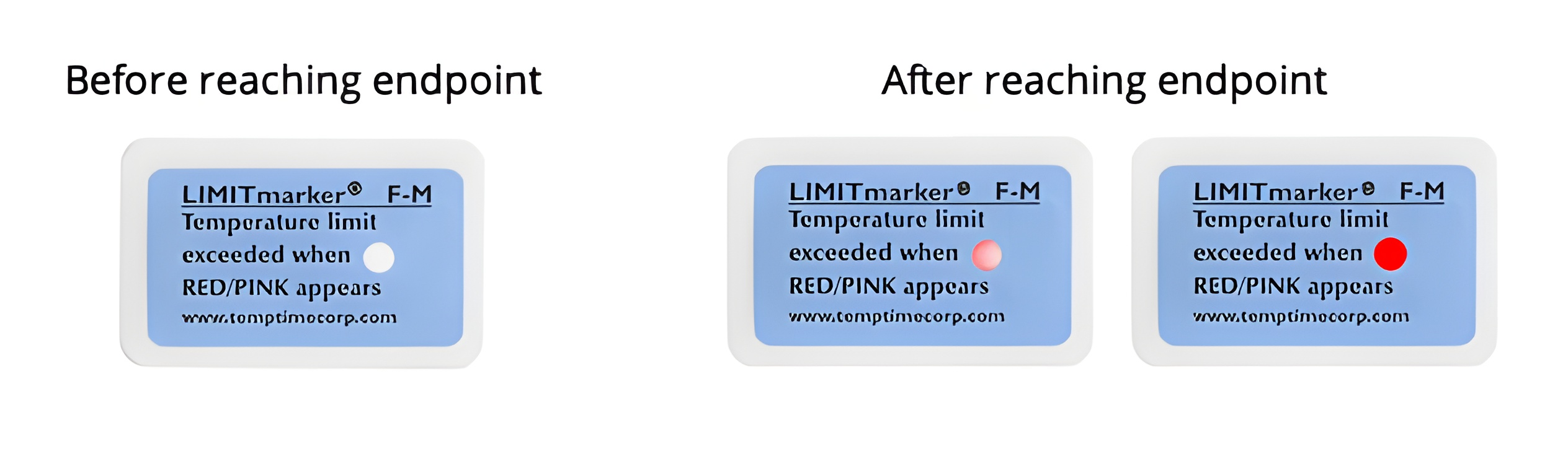 Single-use indicators that provides an easy-to-read, irreversible visual color change when there has been exposure to a temperature above the threshold limit. The technology is based on the precise melting of heat-fusible materials at specified temperatures. The easy-to-read color change from grey to black is a visual signal when there has been a heat excursion above the predetermined temperature profile. Many medical products can be damaged and lose strength when exposed to temperatures above a certain threshold. Such excursions can go unnoticed during shipping and storage. Leading medical product manufacturers and distributors use LIMITmarker I-C and I-P.