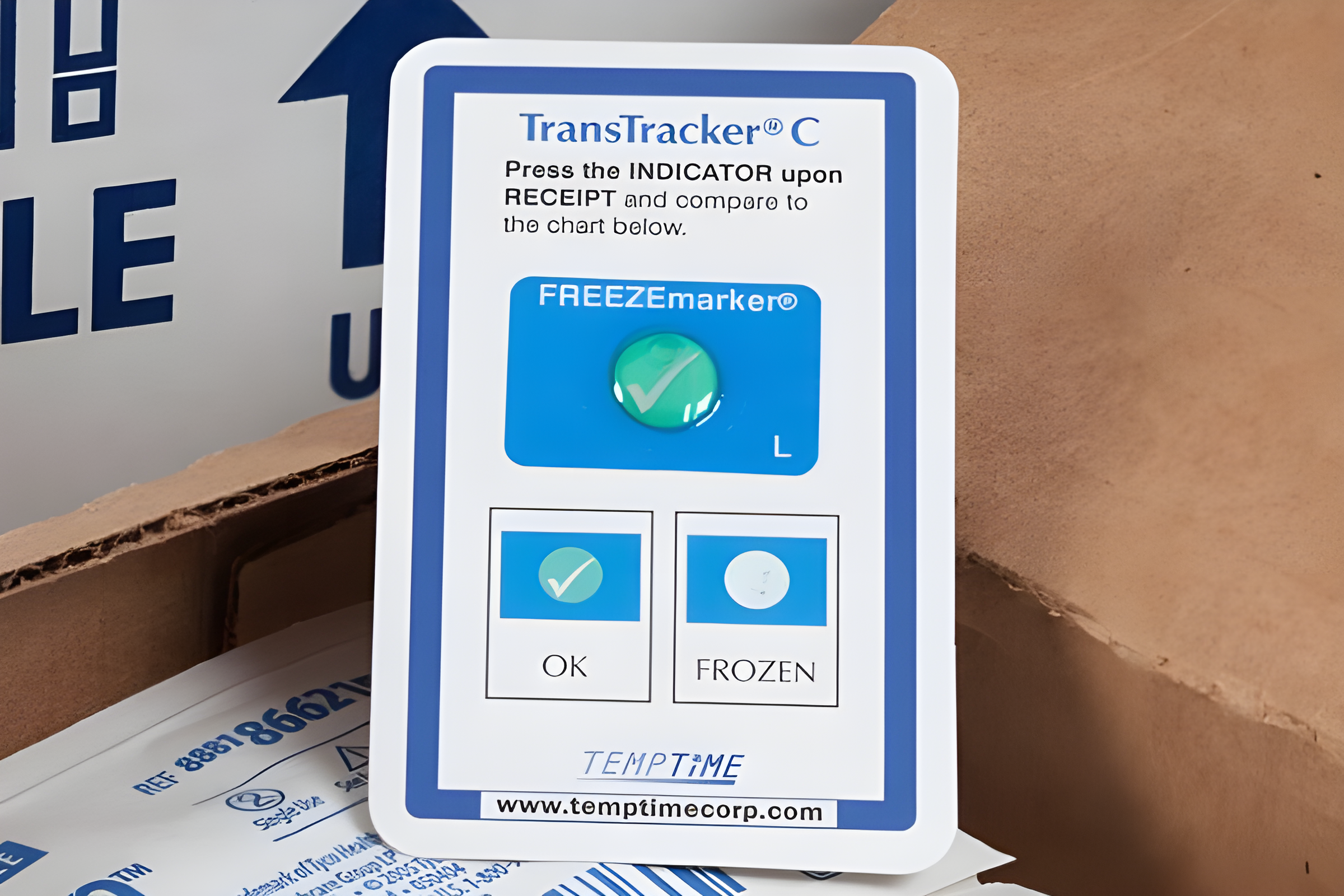 TransTracker with FREEZEmarker® indicators are placed in packaging to monitor freeze events during shipping. FREEZEmarkers display a clearly visible green circle and white checkmark to indicate that temperatures have remained above the response temperature.