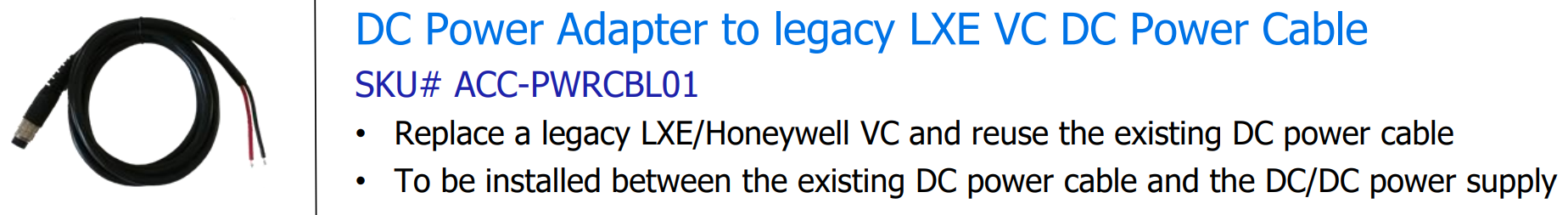 Zebra DC Power Adapter to legacy LXE VC DC Power Cable ACC-PWRCBL01