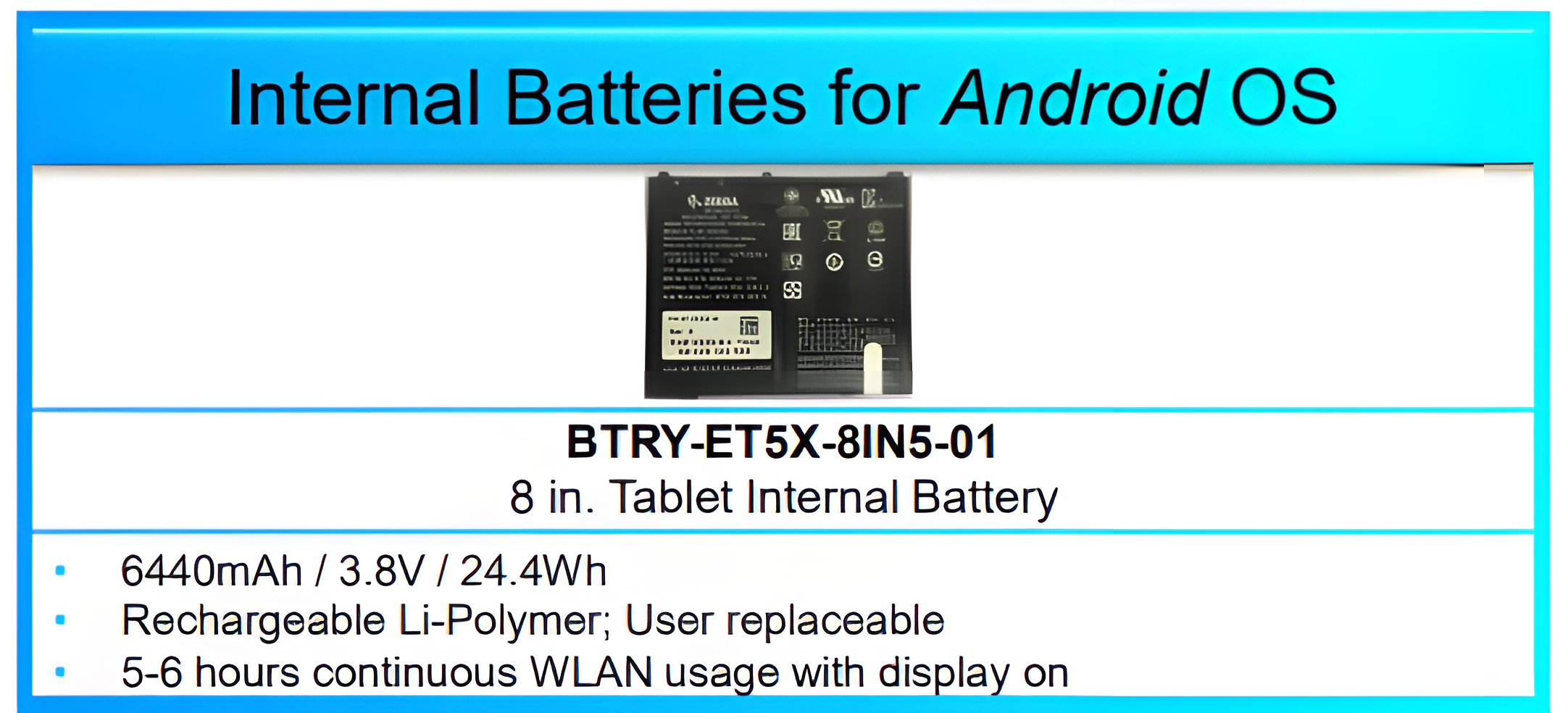 Battery Pack, Lithium Polymer, 6440 mAHr / 3.8 V / 24.4 WHR, ET51 Or ET56, 8 Android Only, Replacement Internal Battery