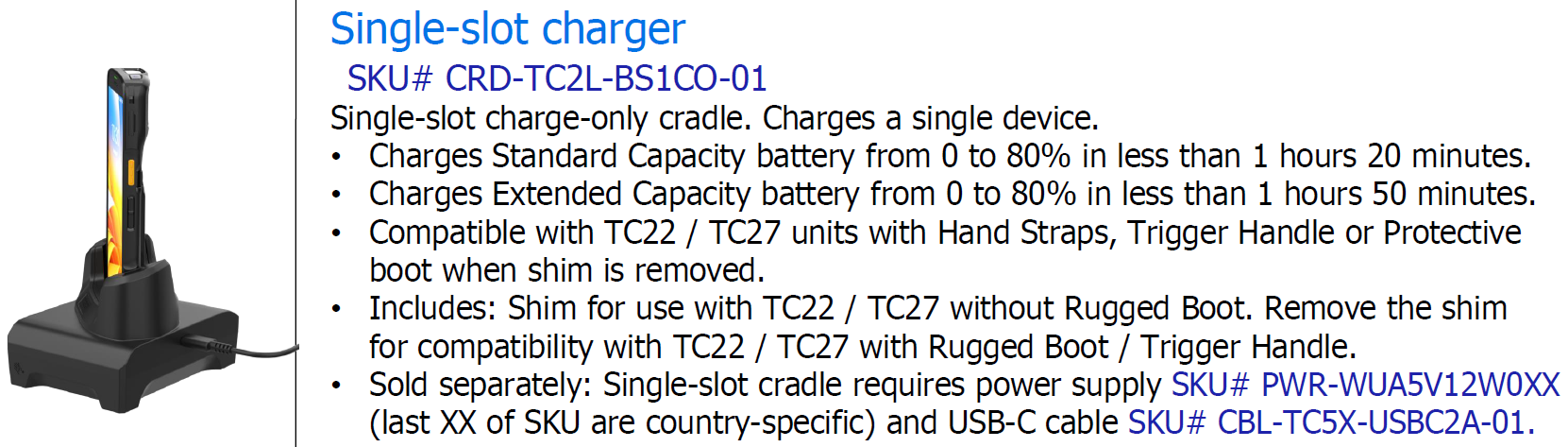 Requires: CBL-TC5X-USBC2A-01 Zebra USB C to A Communications and Charging Cable