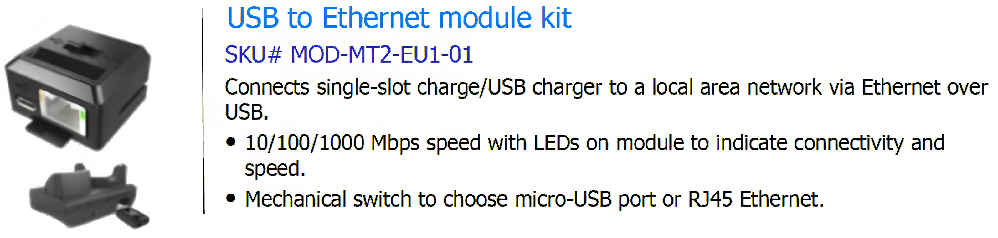Zebra USB to Ethernet Module. Attaches to the Single-Slot USB/Ethernet Capable Charger (CRD-NGTC5TC7-2SE1B) to Provide Ethernet Support. Mechanical Switch Selects Between USB B Port and RJ45 Ethernet Jack.Zebra Technologies Parts & Accessories