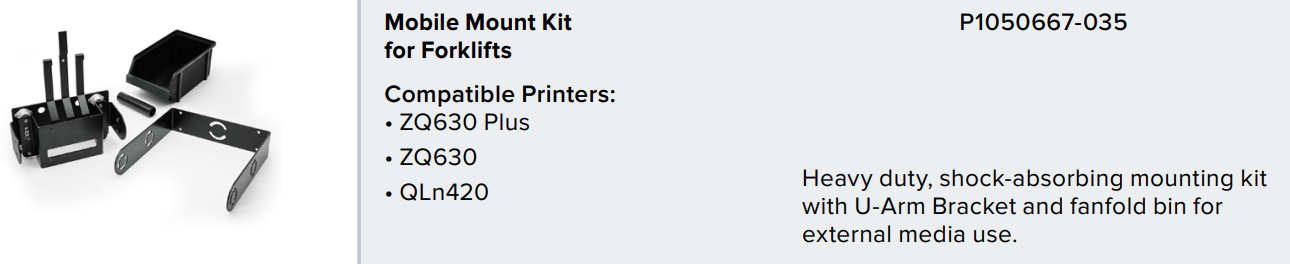 Zebra, Accessory, Kit QLN4/ZQ63 Mobile Mount for Forklifts (With U-Arm Bracket and Fanfold Bin)