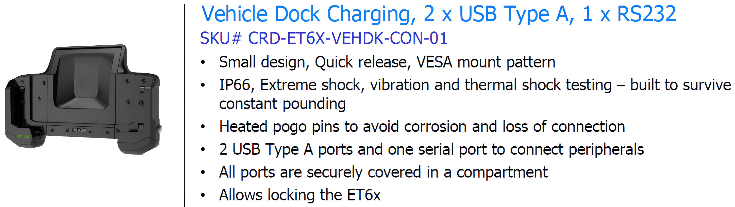 Zebra, ET6X Vehicle Dock Charging, 2 X USB Type a, 1 X RS232Zebra Technologies Parts & Accessories